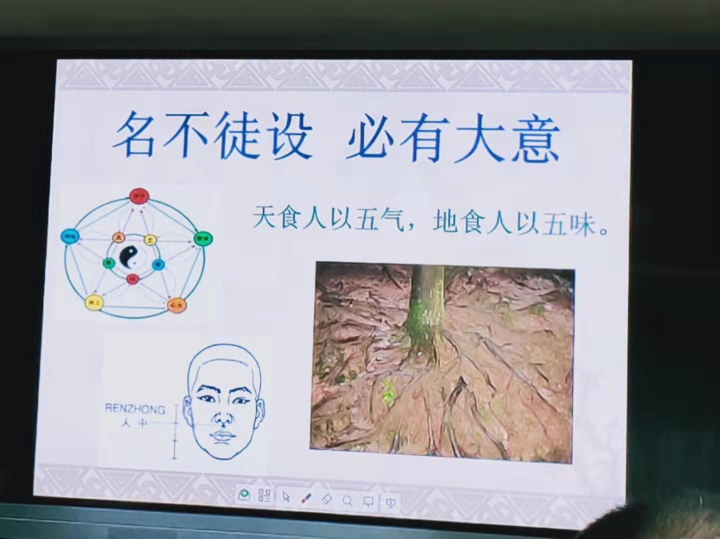 中医翻译可谓世界难题。李照国教授指出,理解中医术语和中医文化思想,须立足国学,尊重先贤,并贯通古今。做好中医的翻译与对外传播,必须打好国学基础。讲座中,李教授以 “人中”二字的翻译为例,追根溯源,带领我们体会了中医所蕴含的中华文化哲学思想,启发我们多读多看多思考。